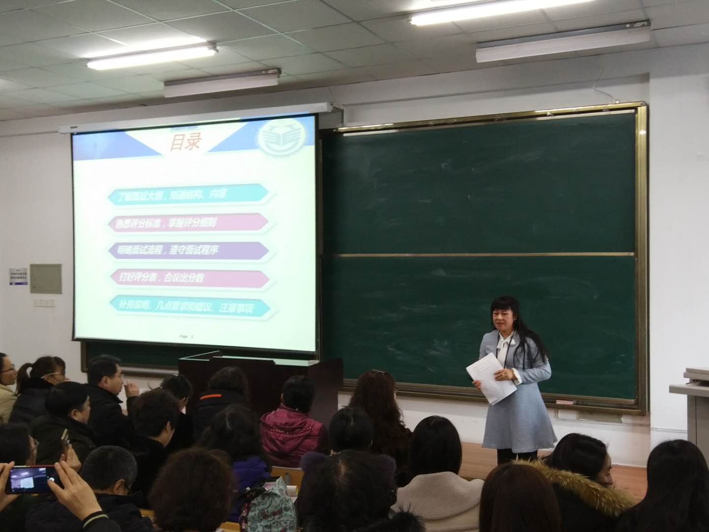 培训由继续教育学院副院长薛然巍主持。首先,技术负责人贾立柱、刘佰泉先后对面试测评系统从角色介绍、组长功能、考官功能、成绩提交四个部分进行了讲解;其次,韦华教授从教师资格考试标准、面试大纲、面试评分标准、面试评分细则、面试评分表、面试流程等几个方面对考官组长和考官的职责逐一进行了细致的讲解;最后,薛然巍对本次培训进行了总结并就过程录像、试讲计时、禁止携带手机、核对考生照片、争议仲裁等几个问题进行了重点强调。