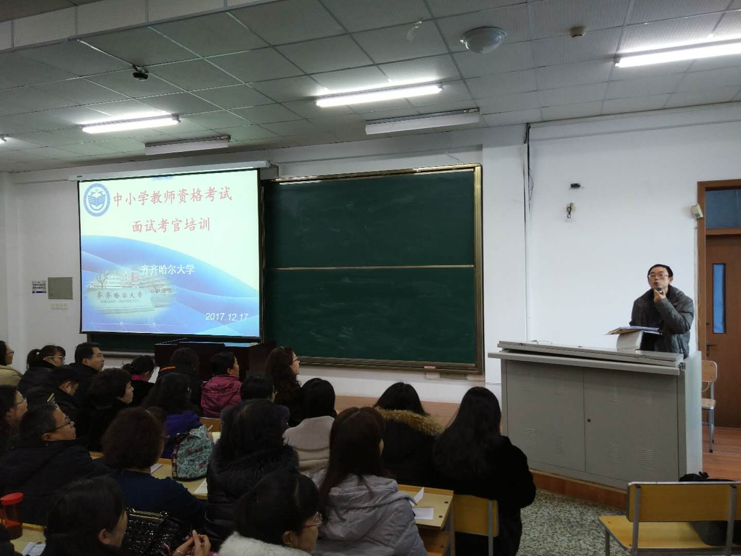 全国中小学教师资格考试面试工作将于2018年1月6-7日举行,按照省教育厅的部署,我校于2017年12月17日上午9:00-11:30在齐齐哈尔大学西区主楼阶梯教室201举行了全国中小学教师资格考试面试考官培训。共有齐齐哈尔市各县区、大兴安岭地区各县区、齐齐哈尔大学、齐齐哈尔高等师范专科学校的近三百名考官库成员参加了本次培训。